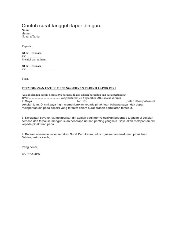 Contoh surat pertukaran tempat bertugas d ent contoh via blackhairstylecuts contoh surat penangguhan lapor diri via slideshare garis panduan. Surat Lapor Diri Bertugas. Tempoh sah laku surat tawaran bagi calon yang diluluskan penangguhan tarikh lapor diri bertugas oleh ketua perkhidmatan adalah sehingga.
